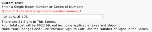 Ground: Our standard shipping method is UPS Ground. Once your order is completed (10 - 15 business days), your items will typically arrive in one to five days after they are shipped. Q: I believe I am missing an item and/or my order is incorrect. What should I do? ANSWER: Please Contact Us and speak with one of our customer service representatives. We will be happy to assist you with any questions or concerns you may have about your order. Q: When my order arrived some of the items were damaged due to shipping. What should I do? ANSWER: Simply Contact Us and let one of our customer service representatives know. We will always replace any items damaged through shipping. Q: What do I do if my sign breaks, chips, or needs repair? ANSWER: We are committed to your complete satisfaction and we believe in the durability of our products. Therefore, we have a Life–of–the–Building Guarantee. We will replace any sign at any time during the life of your building due to defects in material or workmanship. That's right, any sign at any time. Q: Do I need to return the damaged and/or incorrect items? ANSWER: In most cases, we will not ask you to return any damaged or incorrect items. However, if we do ask you to return your order, you will not be charged for return shipping. Shopping Cart Q: How do I add more signs to my shopping cart? ANSWER: If you are in the shopping cart, simply click "Continue Shopping" to add more signs. You can also use the drop-down navigation menu or search box to find the signs you need. Q: How do I remove items from my shopping cart? ANSWER: Once in your shopping cart, simply click "Remove Item" located next to the product you wish to remove. To increase or decrease the quantity of a particular sign, enter the # in the quantity box next to the sign you wish to increase/decrease. Then click "Update Qty" to save any changes. Note: The only exception to this is room numbers. You must click "Edit" to increase the quantity of room numbers from your shopping cart. Q: How do I order two or more of the same signs? Do I need to add them to my cart separately? ANSWER: If the sign color, graphic color, and text are exactly the same, you can just increase the quantity of the item to the number needed. The quantity is located on the product customizing page, as well as in the shopping cart. Note: The only exception to this is room numbers. You cannot increase the quantity of room numbers from your shopping cart. Q: I need to finish my order later. Does your website save the signs I place in my shopping cart? ANSWER: Yes. If you are logged in to your account, anything you add to your shopping cart remains there until you submit your order or manually remove the items from your cart. Simply log back in when you return. Then you can preview what is in your cart and submit your order when you are ready to purchase.